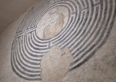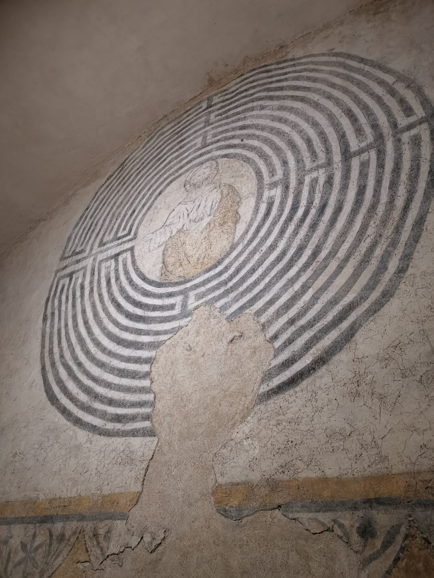 Un labirinto con al centro il Cristo è una rarità assoluta. Per ora un “unicum”. Ed è ad Alatri (paesotto della Ciociaria che ritroveremo nei miei viaggi per altri motivi). E’ nascosto in un intradosso di quello che fu il chiostro della chiesa di san Francesco, che oggi ospita il piccolo museo civico. Un affresco di un metro e mezzo circa di diametro, ventiquattro volute, dodici bianche, dodici nere.