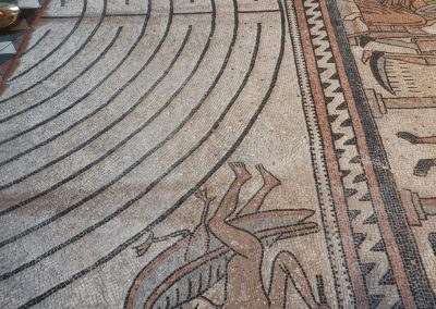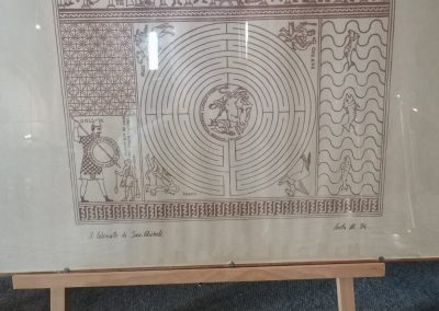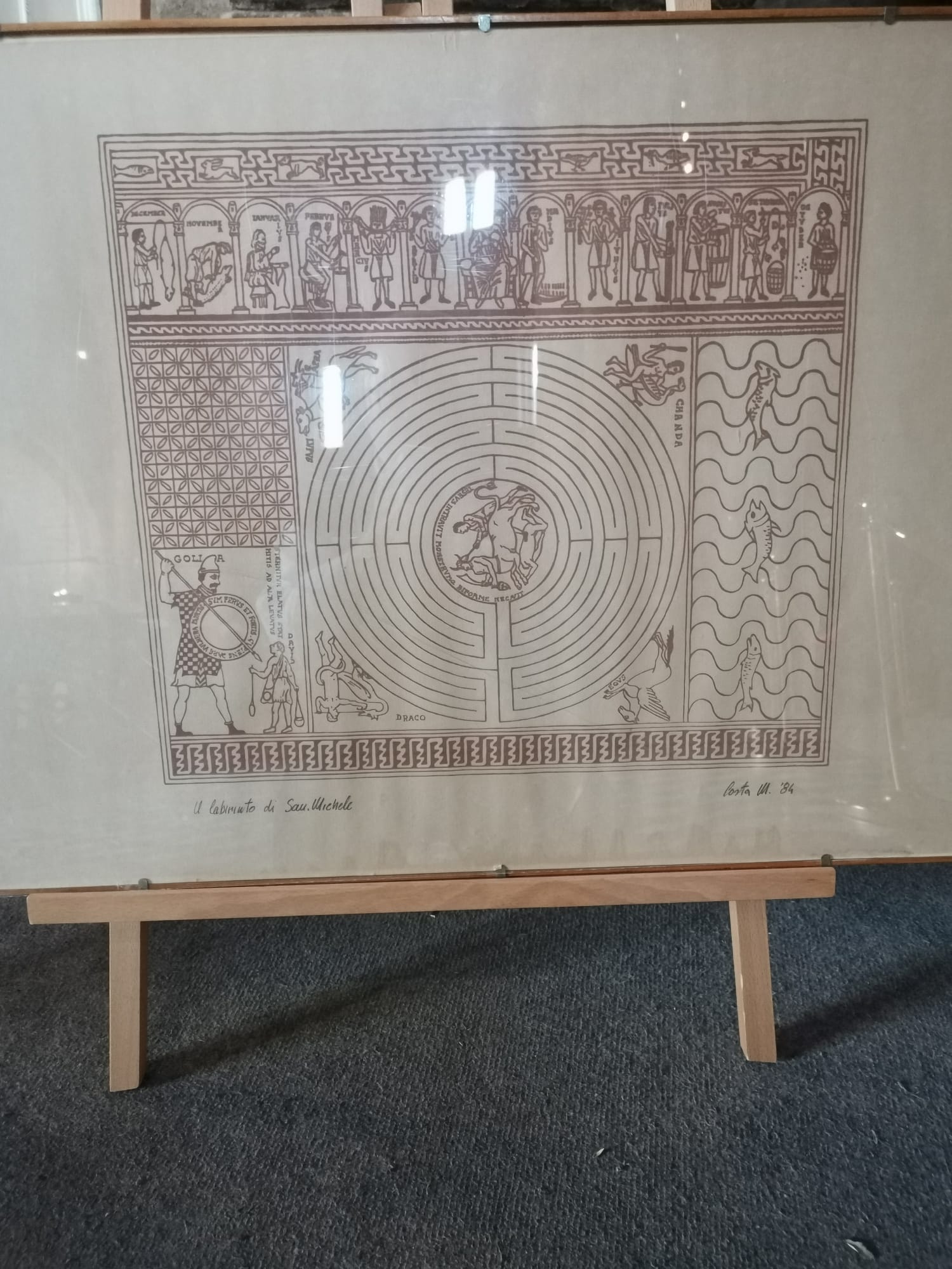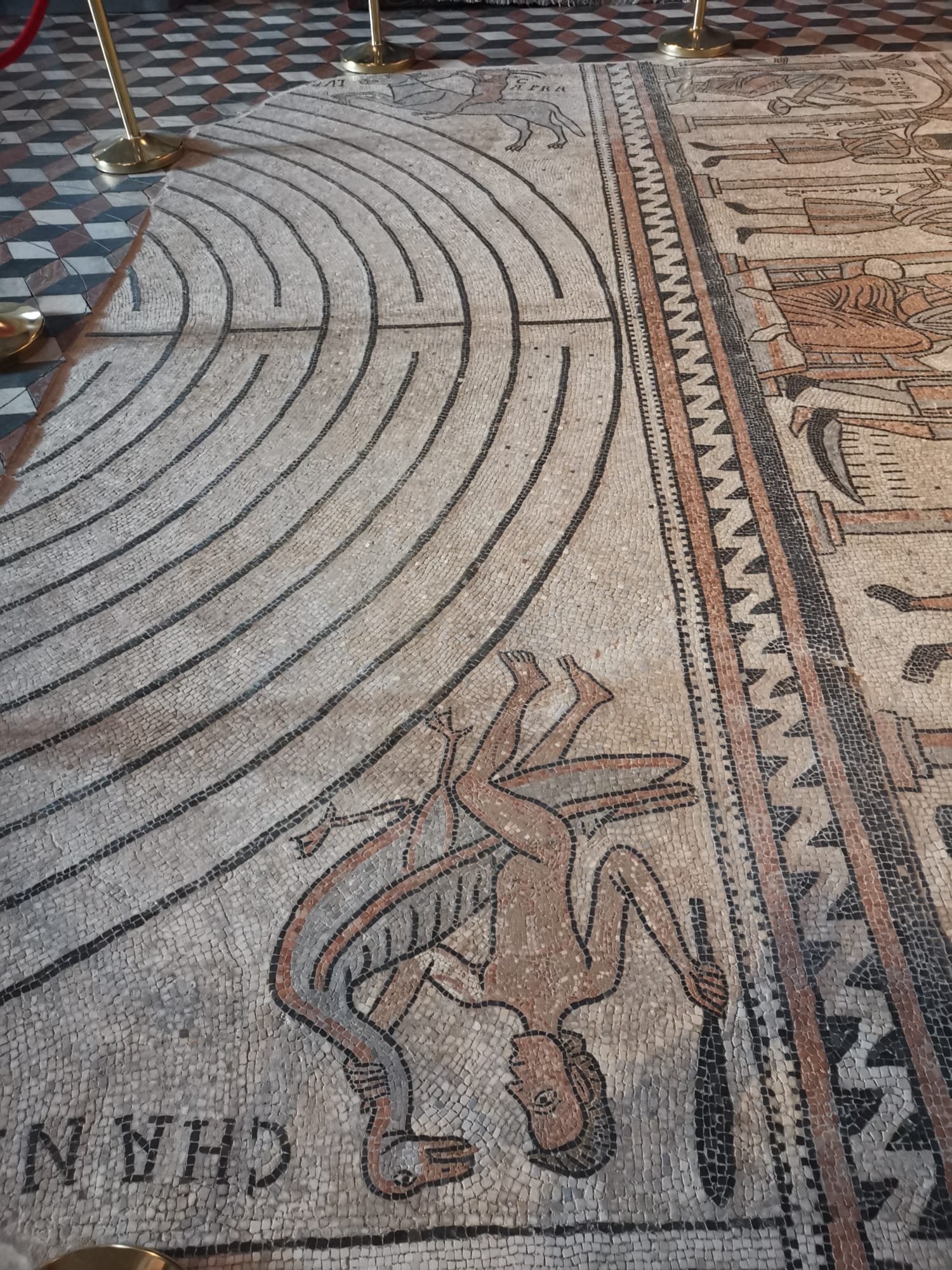 Il più antico labirinto in una chiesa cristiana è quello sul pavimento della Basilica di San Vitale a Ravenna. Molto più tardi, in molte chiese si diffonde la decorazione pavimentale a forma di labirinto, sempre unicursale, cioè a senso unico, dove entrata e uscita coincidono (Chartres, Amiens, Reims, ma anche Siena, Pontremoli e Lucca). Ma al centro c’è quasi sempre il fiore della vita, la rosa a sei lobi, o qualche simbolo geometrico. Mai il Cristo. Nella chiesa di san Michele a Pavia, nel presbiterio c’è il resto di un labirinto a mosaico (foto), la cui interezza è recuperabile da un disegno cinquecentesco conservato nella Biblioteca Vaticana e riprodotto in loco per dare conto di quello che non c’è più: in questo caso è evidente il sincretismo tra labirinto mitologico e rilettura cristiana: un Teseo-Cristo elimina il Minotauro-Satana, restituendo il labirinto al suo semplice percorso (diventerà anche percorso di gioie, nei giardini di tante dimore nobiliari), sottraendolo al mistero e alla perdizione.