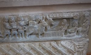 La seconda perla – la croce in porfido la consideriamo alla stregua di una curiosità – è invece il grande sarcofago che campeggia nella piccola navata di destra della chiesa. Un’opera datata 350 dopo Cristo, che sul fregio rappresenta, accanto all’episodio del Vecchio Testamento dei tre giovani indenni nella fornace di Nabuccodonosor, il “primo presepe della storia”.