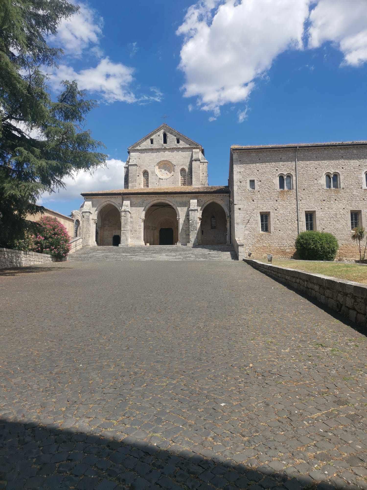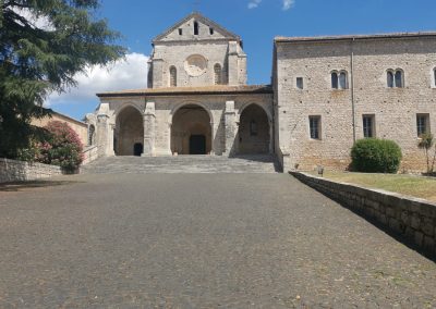 Non arriva subito. Il muro di cinta del complesso abbaziale è sulla strada provinciale che da Frosinone va verso Isola del Liri, all’altezza di Veroli. Non c’è un traffico infernale, ma è una strada di transito intenso. Le indicazioni stradali sono meno che essenziali. Quasi inesistenti (se non sulla superstrada per Sora). Ma quando chiedi dell’Abbazia, tutti ti dicono: “La vedrai di fronte”. Vero. Ti arriva in faccia, se vieni da Frosinone. Muri in pietra grezza, un ingresso, come in un castello. Un vasto parcheggio, a fianco. Entrando nel primo grande cortile, guardando a sinistra si vede la chiesa, sulla destra la farmacia e l’ingresso al chiostro.