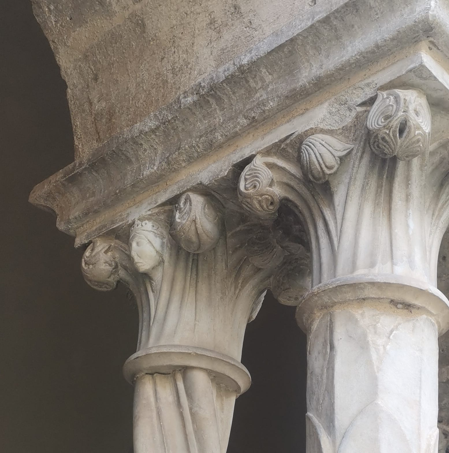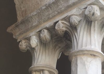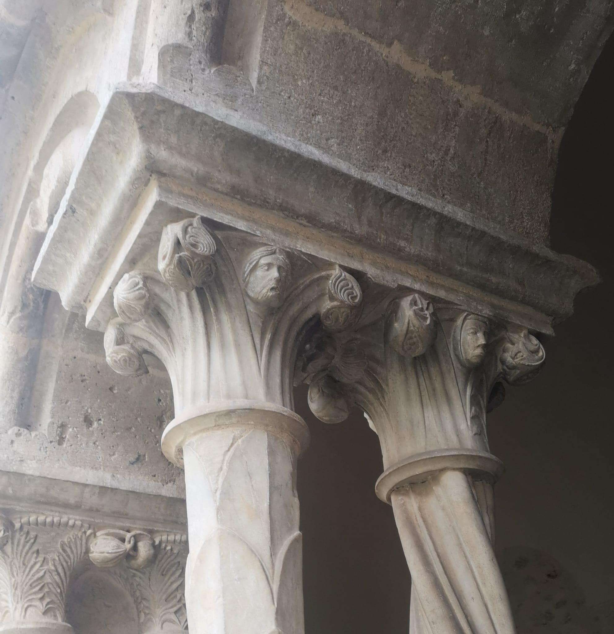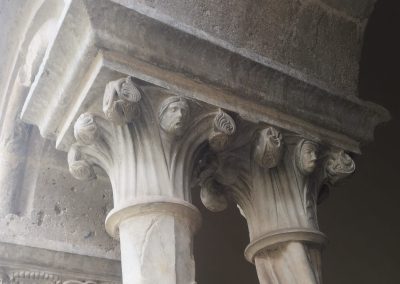 Lo “Stupor Mundi” (1194-1250) – la definizione che ne tratteggia una visione planetaria è stata coniata da un monaco benedettino inglese Matteo Paris, nessun altro la usò ai suoi tempi, ma è piaciuta molto nel tempo - frequentò più volte l’abbazia; nonostante le due scomuniche volle essere affiliato ai cistercensi, mori con la tonaca indosso. E nel chiostro la devozione si mostra reciproca, oltre il lapsus del monaco del negozio di oggi. Uniche figure umane nei capitelli del lato sud ecco quelle dell’imperatore Federico (foto), da solo, e nella bifora accanto due volti (foto) facilmente attribuibili a Pier delle Vigne e all’abate Giovanni, priore di Casamari e consigliere insostituibile dell’imperatore: Giovanni, a differenza del protonotaro immortalato da Dante tra i suicidi, non cadde in disgrazia.