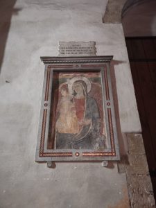 L’unica immagine all’interno della chiesa – oltre alla tela ottocentesca all’ingresso – è quella di un piccolo affresco duecentesco (quindi successivo alle indicazioni di San Bernardo), circondato da una cornice marmorea decorata da intarsi di stile cosmatesco.