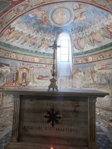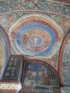 Oggi le mostre si dotano di sale immersive, di realtà aumentata, nulla a che vedere con questa che è immersiva e aumentata “al naturale”. Sotto i piedi un pavimento cosmatesco abbagliante e policromo; tutto il resto, tutto attorno, pittura a fresco senza soluzione di continuità (la foto in apertura così “immersiva” mi è stata fornita da un’amica, che di arte se ne intende davvero, e che ha collaborato con l’architetto che ideò l’illuminazione nel corso dei restauri di fine anni Novanta del secolo scorso).