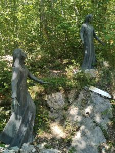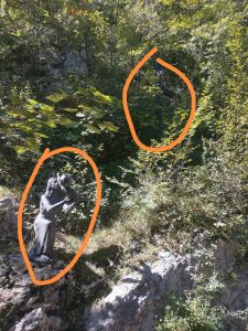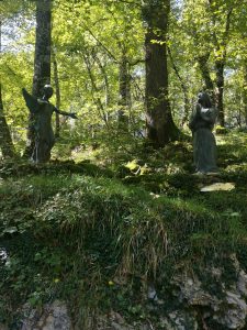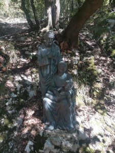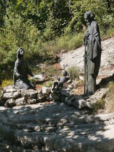 Oggi il luogo conserva un profumo di spiritualità, per il silenzio che accompagna discesa e risalita dalla provinciale al cancello del Santuario, e soprattutto per le grandi statue in bronzo – come in un Sacro Monte - collocate nella seconda metà dell’Ottocento, che rappresentano i cinque misteri gaudiosi del Rosario: l’Annunciazione, la visita di Maria a Elisabetta, la Nascita di Gesù, la Presentazione al Tempio (questo “quadro” mi ha dato più di una suggestione: la presentazione è quasi un’offerta, sullo sfondo campeggia la croce, si veda la foto), il ritrovamento di Gesù nel Tempio.