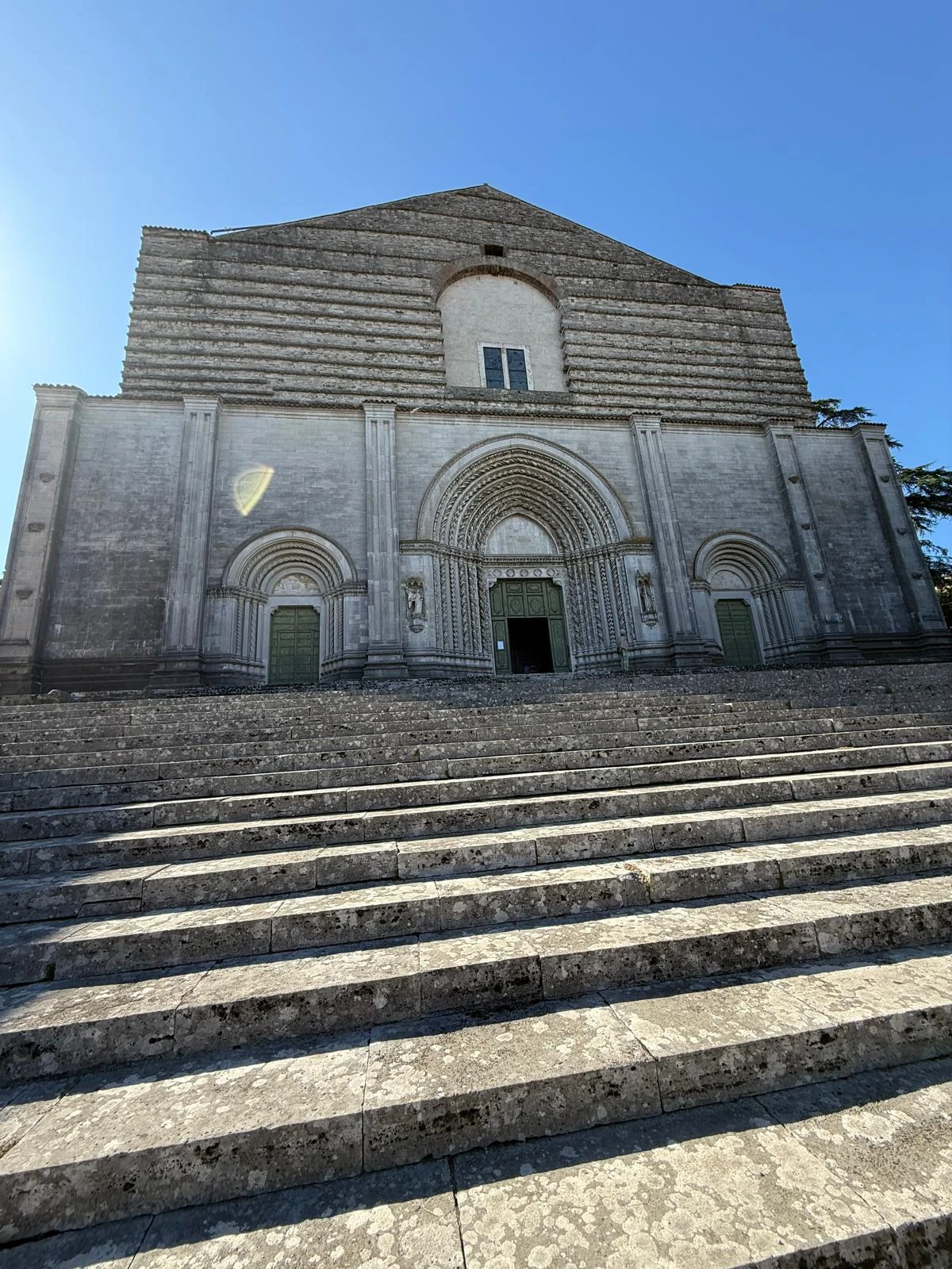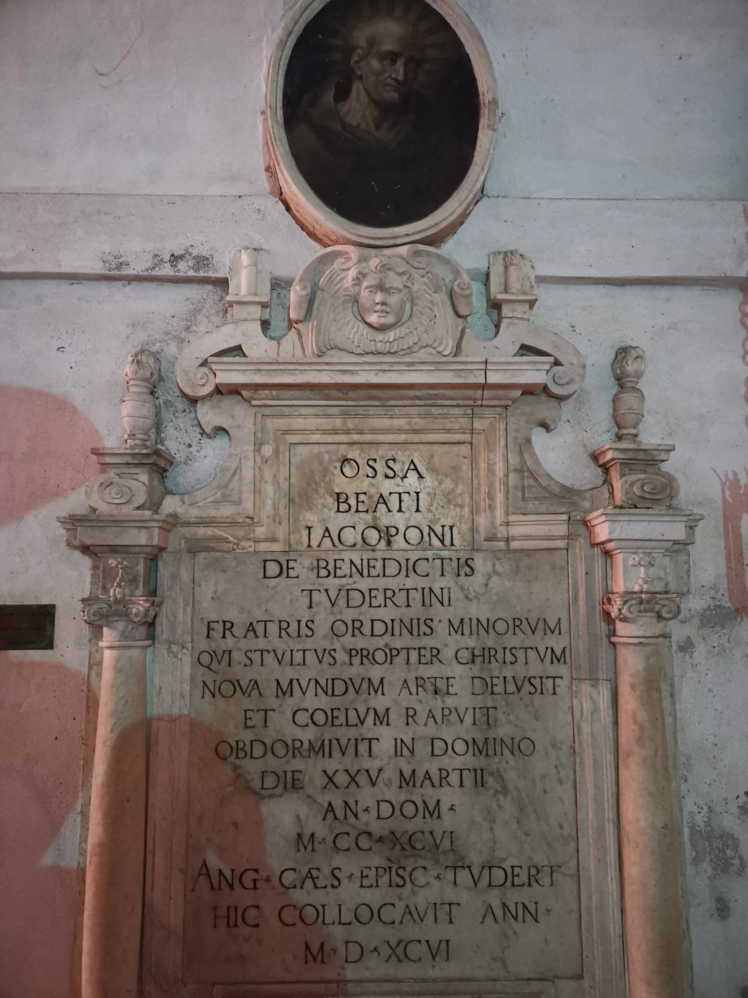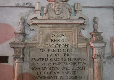 Quella porzione di muro affrescata (oggi protetta nell’altare sotto la cupola rinascimentale, foto) diventò oggetto di culto e ragione della costruzione del Tempio mariano. D’altronde a Todi la devozione a Maria aveva dato una delle voci più alte e struggenti: Jacopo dei Benedetti, il beato fra’ Jacopone da Todi (1230-1306, sepolto nella Chiesa di San Fortunato, foto: la lapide riporta la data di morte falsificata, 1296, per “dimenticare” la scomunica inflittagli da Bonifacio VIII). Poeta da rileggere sempre: la laude “Donna de Paradiso” continua a commuovere ben oltre i banchi di scuola; lo “Stabat Mater” continua ad accompagnare le meditazioni del Venerdì Santo.