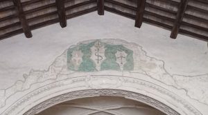 Gli affreschi che decorano l’arco trionfale riproducono tre scudi appesi alla parete in risalto su un drappo verde: a sinistra c’è lo stemma della città di Ferentino (il giglio bianco su fondo rosso), al centro, in maggiori dimensioni, quello dei Fratelli dello Spirito Santo fondati da Pietro del Morrone (sull’arma a fondo bianco la croce ha la lettera S sovrapposta al suo asse verticale; sopra l’arma è riprodotta la tiara pontificia), e a destra è dipinto lo stemma dell’Ordine Ospedaliero degli Antoniani (sull’arma a sfondo bianco si staglia il Tau, sul quale è riprodotta la croce infissa sul Calvario, raffigurato da tre piccoli monti).